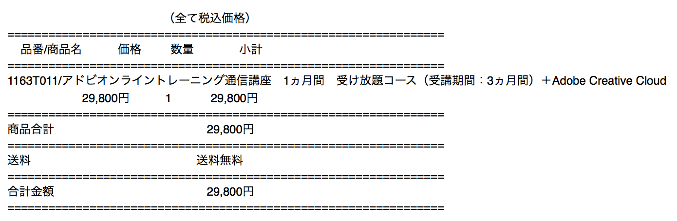 2018年11月現在、キャンペーン価格として46000円が29800円(税込)で購入できました。キャンペーン価格と書いてありますが、実はキャンペーンは毎月のように展開しています。月末になると「セール」が終わり、月の初旬は価格が46000円程度まで跳ね上がるのですが、しばらく様子を見ると再び29800円に下がります。特典付き通信講座の最安価格は、デジハリと並んで最安になります。