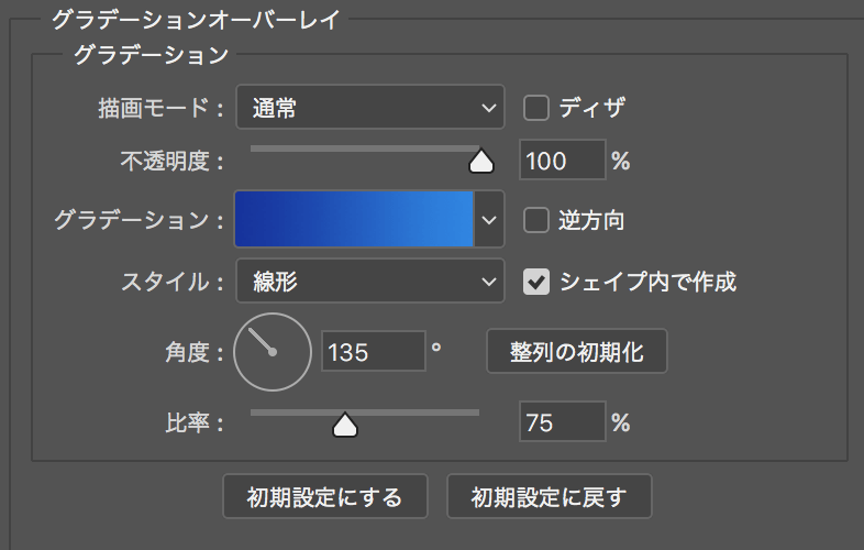 最初にグラデーションオーバーレイを選択。グラデーションの角度を135度にして、カラーは左上から右下に向かって濃くなるイメージで設定。
