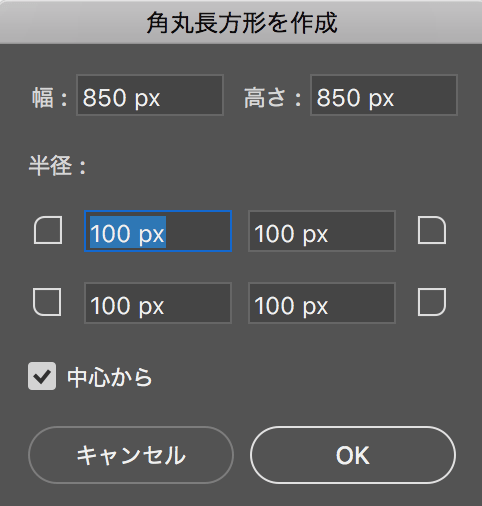面上でダブルクリックすると、大きさの設定画面が出るので、正方形となるように設定(図では850px)。半径も適当な大きさにしましょう(今回は100px)。中心からにもチェックを入れておきます。