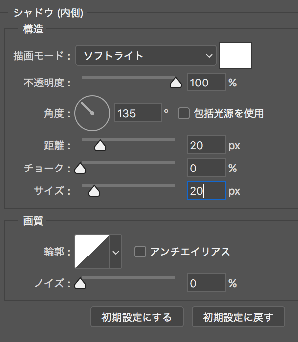 続いて、シャドウ(内側)の設定に入ります。構造にある描画モードは「ソフトライト」、カラーは「白」、不透明度は「100」、角度は「135度」、距離「20px」、チョーク「0%」、サイズ「20px」、包括光源はオフに設定。